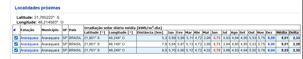 Esses dados são amplamente utilizados por projetistas e servem como referência confiável para estimar a geração de sistemas fotovoltaicos.