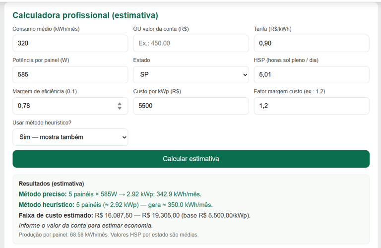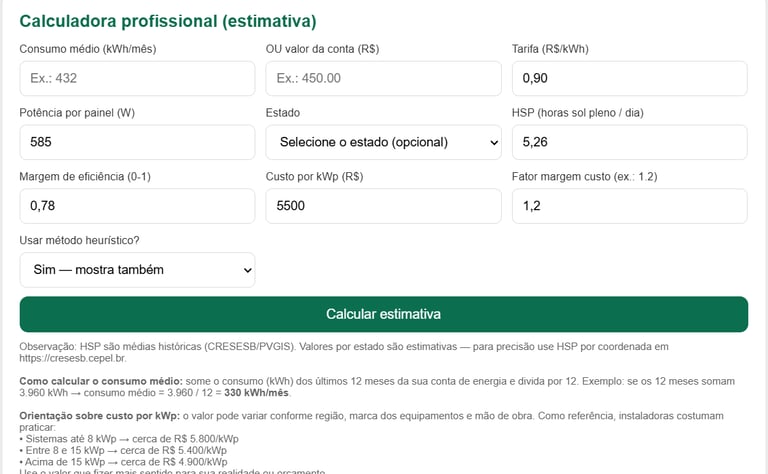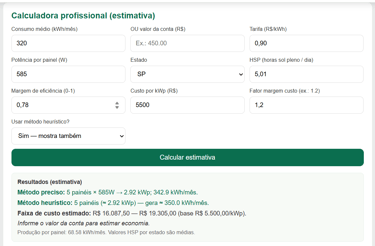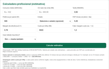 A calculadora utilizada neste exemplo é uma calculadora profissional de estimativa, que considera não apenas o consumo, mas também fatores como irradiação solar, eficiência do sistema e custo médio por kWp.