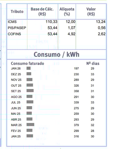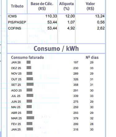 Alguns dados da conta de luz utilizada neste exemplo foram ocultados por segurança, mantendo apenas as informações necessárias para o cálculo.